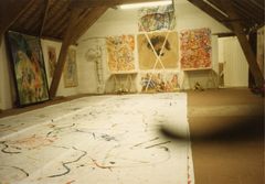 This exhibition was a duo-show of work by Ariane Tierssoone and Jef Lambrecht, but also became an installation/environment/composition using various aspects of the house – in fact the show lasted only a day, due to unforeseen complications and had to be removed in all haste. Here some 'action' photographs, references to displayed works and the creation of the 'JEP' banner, made on the spot as a sort of performance. Though short-lived it was a seminal exhibition.